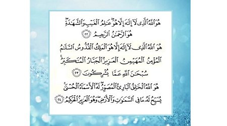 هُوَ اللَّهُ الَّذِي لَا إِلَهَ إِلَّا هُوَ عَالِمُ الْغَيْبِ وَالشَّهَادَةِ هُوَ الرَّحْمَنُ الرَّحِيمُ (22) هُوَ اللَّهُ الَّذِي لَا إِلَهَ إِلَّا هُوَ الْمَلِكُ الْقُدُّوسُ السَّلَامُ الْمُؤْمِنُ الْمُهَيْمِنُ الْعَزِيزُ الْجَبَّارُ الْمُتَكَبِّرُ سُبْحَانَ اللَّهِ عَمَّا يُشْرِكُونَ (23) هُوَ اللَّهُ الْخَالِقُ الْبَارِئُ الْمُصَوِّرُ لَهُ الْأَسْمَاءُ الْحُسْنَى يُسَبِّحُ لَهُ مَا فِي السَّمَاوَاتِ وَالْأَرْضِ وَهُوَ الْعَزِيزُ الْحَكِيمُ [الحشر:22-24]