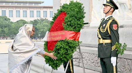 পুষ্পস্তবক অর্পণের পর বিপ্লবীদের স্মৃতির প্রতি গভীর শ্রদ্ধা জানিয়ে কিছুক্ষণ নীরবে দাঁড়িয়ে থাকেন শেখ হাসিনা। এসময় বিউগলে বেজে ওঠে করুণ সুর। এ সময় দুই দেশের জাতীয় সংগীত বাজা হয় এবং চীনের সশস্ত্র বাহিনীর একটি চৌকস দল রাষ্ট্রীয় সালাম দেয়। চীনের প্রধানমন্ত্রী লি কিংয়ের আমন্ত্রণে বেইজিং সফরে আছেন প্রধানমন্ত্রী শেখ হাসিনা। গতকাল সোমবার সন্ধ্যায় বেইজিং আসেন তিনি।