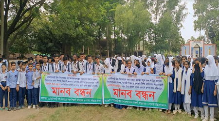 মশিউর রহমান, আশুলিয়া (ঢাকা) প্রতিনিধি : ঢাকার আশুলিয়ায় গোহাইলবাড়ি উচ্চ বিদ্যালয়ের প্রধান শিক্ষক, সহকারী শিক্ষক ও এলাকার গণ্যমাণ্য ব্যক্তিদের নামে দায়ের করা মিথ্যা মামলা প্রত্যাহারের দাবীতে মানববন্ধন কর্মসূচি পালন করেছে শিক্ষক, শিক্ষার্থী ও এলাকাবাসি। এসময় গোহাইলবাড়ি উচ্চ বিদ্যালয়ের বন্যা আশ্রয়ণ প্রকল্পের নতুন ভবন নির্মাণে বাধাঁদানকারীর বিরুদ্ধে শাস্তির দাবী জানানো হয়। মানব বন্ধন শেষে জিরানী-আমতলা আঞ্চলিক সড়কে বিক্ষোভ মিছিল করে এবং পরে সংক্ষিপ্ত সমাবেশ করেন।