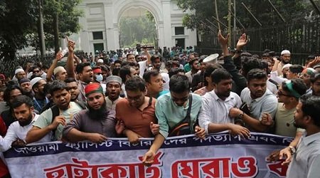 এসময় শিক্ষার্থীরা, ‘ফাঁসি ফাঁসি ফাঁসি চাই, খুনি হাসিনার ফাঁসি চাই’; আবু সাঈদ মুগ্ধ, শেষ হয়নি যুদ্ধ’; স্বৈরাচারের দালালেরা, হুঁশিয়ার সাবধান’; ঘেরাও ঘেরাও ঘেরাও হবে, হাইকোর্ট ঘেরাও হবে’; দালালি না রাজপথ, রাজপথ রাজপথ’; ‘দিল্লী না ঢাকা, ঢাকা ঢাকা’; আপস না সংগ্রাম, সংগ্রাম সংগ্রাম’; ‘জেগেছে রে জেগেছে, ছাত্র সমাজ জেগেছে’ ইত্যাদি স্লোগান দিতে থাকেন।