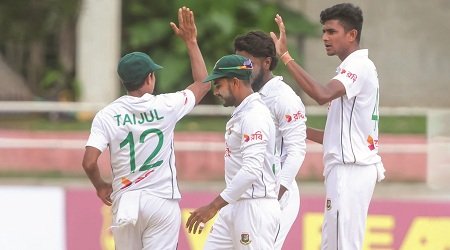 ৭০ রানে তৃতীয় দিন শুরু করেছিল উইন্ডিজ। হাতে ছিল ৯ উইকেট। ক্রেইগ ব্র্যাথওয়েট ৩৩ আর কিচি কার্টি ১৯ রানে অপরাজিত থেকে ব্যাট করতে নামেন। শুরু থেকেই দুজনে সাবধানী ব্যাটিং করে যান। তাদের জুটি ৫০ পেরিয়ে ৬০ রানে পৌঁছায়। তবে এ জুটিকে আর বড় হতে দেননি তরুণ পেসার নাহিদ রানা। গতির ঝড় তুলে শুরু থেকেই ক্যারিবীয়দের অস্বস্তিতে রেখেছিলেন তিনি। শেষমেশ সফলও হলেন। তার বাউন্সার ব্যাকফুটে সামলাতে চেয়েছিলেন ব্র্যাথওয়েট। ঠিক মতো পারেননি। ব্যাটের শোল্ডারে লেগে ক্যাচ যায় গালিতে। সেখানে কোনো ভুল করেননি বদলি ফিল্ডার জাকির হাসান। দলীয় ৮৫ রানে দ্বিতীয় উইকেট হারায় উইন্ডিজ। ১২৯ বলে ৩ চারে ৩৯ রানে থামেন ব্র্যাথওয়েট।