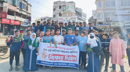 এম এ রহিম চৌগাছা (যশোর) : ভারতের আগরতলায় সহকারী হাইকমিশনে হিন্দুত্ববাদী সন্ত্রাসীদের হামলা ও ভাঙচুরের প্রতিবাদে যশোরের চৌগাছায় বিক্ষোভ মিছিল ও সমাবেশ করেছে বৈষম্যবিরোধী শিক্ষার্থীরা। মঙ্গলবার (০৩ ডিসেম্বর) দুপুর দেড়টায় শহরের সরকারি শাহাদাৎ পাইলট মডেল মাধ্যমিক বিদ্যালয় প্রাঙ্গন থেকে বিক্ষোভ মিছিল শুরু হয়। প্রায় অর্ধশতাধিক শিক্ষার্থীদের অংশগ্রহণে আয়োজিত মিছিলটি বাজারের বিভিন্ন গুরুত্বপূর্ণ সড়ক প্রদক্ষীন শেষে আবু সাইদ চত্ত্বরে (পুরনো ভাস্কর্য মোড়) এসে এক সমাবেশে রুপ নেয়।