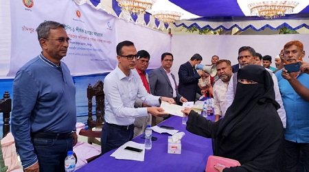 ডেস্ক নিউজ : চাঁদপুরে আধুনিক নৌবন্দর নির্মাণের জন্য ক্ষতিগ্রস্ত ১২৭ পরিবার ও ব্যবসায়ীকে ক্ষতিপূরণ হিসেবে ৩ কোটি ২৭ লাখ টাকার চেক দেওয়া হয়েছে। শনিবার (৭ ডিসেম্বর) সকালে শহরের মাদরাসা রোডস্থ দারুল উলুম মাদরাসা মাঠে বাংলাদেশ অভ্যন্তরীণ নৌপরিবহন কর্তৃপক্ষের (বিআইডব্লিউটিএ) পক্ষ থেকে ক্ষতিগ্রস্ত ব্যবসায়ীদের হাতে এসব চেক তুলে দেন প্রধান অতিথি জেলা প্রশাসক (ডিসি) মোহাম্মদ মোহসীন উদ্দিন।