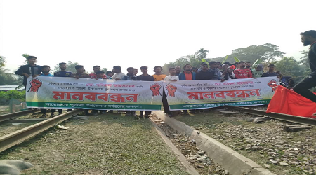 পরে মানববন্ধনে অংশগ্রহণকারীরা পূর্বধলা রেল স্টেশনের প্রায় ১০০ গজ দক্ষিণ পাশে রেল লাইনের উপর গাছের গুড়ি ফেলে রেল পথ অবরোধ করে। বেলা ১টার সময় জারিয়া হতে ঢাকাগামী বলাকা কমিউটার ট্রেন পূর্বধলা রেল স্টেশনে পৌঁছলে ট্রেনটি অবরোধকারীরা প্রায় আদা ঘন্টা পর্যন্ত অবরোধ করে রাখে। এসময় পূর্বধলা থানার অফিসার ইনচার্জ (ওসি) মোহাম্মদ রিয়াদ মাহমুদের হস্তক্ষেপে এবং অবরোধকারীদের উপজেলা নির্বাহী অফিসারের বদলী বাতিল করার বিষয়টি উর্ব্ধতন কতৃপক্ষের সাথে যোগাযোগ পূর্বক বিষয়টি রাত আট ঘটিকার মধ্যে সমাধানের আশ্বাস দিলে অবরোধকারীরা তাদের অবরোধ বেলা অনুমান পনে দুইটার সময় প্রত্যাহার করেন।