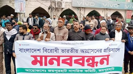 মিজানুর রহমান মিন্টু জয়পুরহাট : বাংলাদেশ বিরোধী ভারতীয় আগ্রাসনের প্রতিবাদে জয়পুরহাটে মানববন্ধন করেছে নাগরিক কমিটি। বৃহস্পতিবার দুপুরে শহরের জিরো পয়েন্টে ঘন্টাব্যাপী এ মানববন্ধন অনুষ্ঠিত হয়। মানববন্ধনে ভারতীয় পণ্য বর্জন করে কাপড় পুড়িয়ে প্রতিবাদ জানানো হয়।