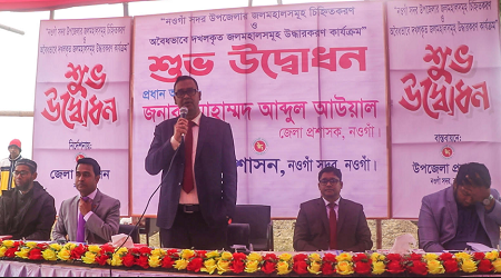 উদ্বোধনী অনুষ্ঠান শেষে সদর উপজেলার সালুকায় একটি দিঘিতে উদ্ধার কার্যক্রমের একটি সাইনবোর্ড প্রতিস্থাপন করেন নওগাঁ জেলা প্রশাসক আব্দুল আউয়াল।