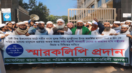 এ সময় আশুলিয়া থানা উলামা পরিষদ ও সর্বস্তরের তাওহীদী জনতার ব্যানারে থানার প্রধান ফটকের সামনে একটি সংক্ষিপ্ত সমাবেশ করেন তারা। এসময় বক্তারা বলেন, টঙ্গী ইজতেমার মাঠে ঘুমন্ত অবস্থায় তাবলীগ নামধারী বিপথগামী পথভ্রষ্ট উগ্রবাদী সাদপন্থীরা সন্ত্রাসী কায়দায় হামলা চালিয়ে অন্তত চার জনকে হত্যা করে। এছাড়াও অসংখ্য শান্তিপ্রিয় সাধারণ মুসল্লী, ওলামাগণ নৃশংস হামলার শিকার হয়ে গুরুতর অবস্থায় দেশের বিভিন্ন হাসপাতালে চিকিৎসাধীন রয়েছেন।