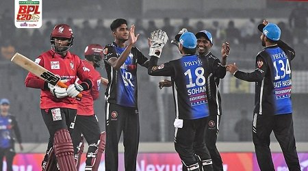স্পোর্টস ডেস্ক : ব্যাটিংয়ে নেমে বরিশালের দুই ওপেনার শুরুতে ভালো কিছুর আভাস দেন। নাজমুল হোসেন শান্ত এবং তামিম ইকবাল মিলে প্রথম ৩ ওভারে ২৫ রান করেন। তবে এরপর হঠাৎ করেই পতন শুরু হয় ডিফেন্ডিং চ্যাম্পিয়নদের। শান্তকে ফিরিয়ে প্রথম ব্রেকথ্রু এনে দেন শেখ মেহেদী। তবে শান্তর বিদায়ের পরেও ওই ওভারে ৩ বাউন্ডারিতে ১৩ রান নেন তামিম।