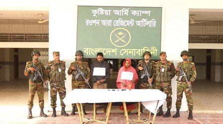মো. সাইদুল আনাম, কুষ্টিয়া জেলা প্রতিনিধি : কুষ্টিয়ার দৌলতপুরে সেনাবাহিনী অভিযান চালিয়ে একটি বিদেশী পিস্তুল ও ৭ রাউন্ড গুলিসহ শীর্ষ সন্ত্রাসী আনোয়ার হোসেন (৩৮) ও তার স্ত্রী কমেলা বেগম (৩৩) কে আটক করেছে। মঙ্গলবার ভোররাতে উপজেলার মথুরাপুর ইউনিয়নের বাগোয়ান মধ্যপাড়া গ্রামের নিজ বাড়ি থেকে অস্ত্র ও গুলিসহ তাদের আটক করা হয়। আটক সন্ত্রাসী আনোয়ার হোসেনের বিরুদ্ধে হত্যা, মাদক চোরাচালান ও অস্ত্র মামলাসহ একাধিক মামলা রয়েছে।