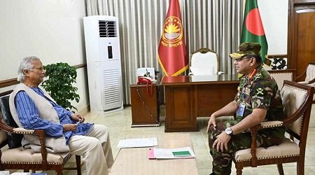 আইএসপিআর জানায়, রাষ্ট্রীয় অতিথি ভবন যমুনায় এ সৌজন্য সাক্ষাৎ অনুষ্ঠিত হয়েছে। সাক্ষাৎকালে সেনাপ্রধান আসন্ন ঈদে দেশের সার্বিক নিরাপত্তা নিশ্চিত করতে সেনাবাহিনী কর্তৃক গৃহীত পদক্ষেপ, লঞ্চ টার্মিনাল, ট্রেন স্টেশন ও বাসস্ট্যান্ডসমূহে নিরাপদ সেবা নিশ্চিতকরণসহ সব সড়কে নিরবচ্ছিন্ন যান চলাচল, শিল্পাঞ্চলের মালিকদের সঙ্গে শ্রমিকদের বোঝাপড়ার ব্যবস্থাকরণ এবং সেনাবাহিনীর চলমান বিবিধ কার্যক্রম সম্পর্কে প্রধান উপদেষ্টাকে অবহিত করেন।
