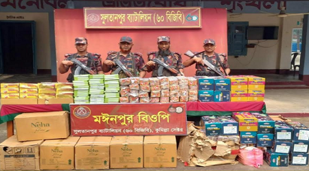 বিজিবি ৬০ ব্যাটালিয়নের অধিনায়ক লে. কর্ণেল জিয়াউর রহমান এ তথ্য নিশ্চিত করেছেন। তিনি জানান, জব্দ করা পণ্যের মধ্যে রয়েছে, এক লাখ ১৮ হাজার ২৩০ পিস বাজি, মেহেদী, গোল্ড বিচ ক্রিম, হার্ডন ব্লু ক্যাপসুল।