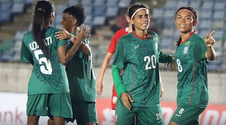 স্পোর্টস ডেস্ক : নারী এশিয়ান কাপ বাছাইয়ের সূচনাতেই জ্বেলে উঠেছে বাংলাদেশ। বাহরাইনের জালে ৭ গোল ঢুকিয়ে রীতিমতো গোলবন্যা বইয়ে দিয়েছে টাইগ্রেসরা। আগের দুই আসরে কোনো জয় না পাওয়া বাংলাদেশ নারী দল এবার নিজেদের তৃতীয় প্রচেষ্টায়ই পেল রেকর্ড গড়া জয়। ফিফা র্যাংকিংয়ে ৩৬ ধাপ এগিয়ে থাকা বাহরাইনকে ৭-০ গোলে উড়িয়ে দিয়েছে লাল-সবুজের প্রতিনিধিরা।