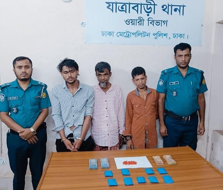 রাজধানীর যাত্রাবাড়ী এলাকা থেকে দুই হাজারপিস ইয়াবাসহ তিন চিহ্নিত মাদক কারবারিকে গ্রেপ্তার করেছে যাত্রাবাড়ী থানা পুলিশ। গ্রেপ্তারকৃতরা হলেন— মো. বাধন (২৪), আলমগীর প্র. পরী (৩৫) ও আব্দুল মান্নান (৪৫)। শনিবার রাতে দক্ষিণ যাত্রাবাড়ী কবরস্থান রোড এলাকায় অভিযান পরিচালনা করে তাদের গ্রেপ্তার করা হয় বলে জানিয়েছেন যাত্রাবাড়ী থানার ভারপ্রাপ্ত কর্মকর্তা (ওসি) কামরুজ্জামান তালুকদার। তিনি জানান, যাত্রাবাড়ী থানা এলাকায় মাদক উদ্ধারে বিশেষ অভিযান পরিচালনাকালে জানা যায়, দক্ষিণ যাত্রাবাড়ী কবরস্থান রোড এলাকায় কিছু মাদক কারবারি মাদকদ্রব্য বিক্রয়ের জন্য অবস্থান করছে। এমন সংবাদের ভিত্তিতে ওই স্থানে অভিযান পরিচালনা করে বাধন, আলমগীর ও মান্নানকে গ্রেপ্তার করা হয়। এ সময় তাদের হেফাজত হতে ২ হাজার পিস ইয়াবা ও মাদকদ্রব্য বিক্রয়ের নগদ ৪৩ হাজার ৮৪০ টাকা উদ্ধার করা হয়। এ সময় কয়েকজন মাদক কারবারি কৌশলে পালিয়ে যায়। পুলিশ জানায়, এ ঘটনায় গ্রেপ্তারকৃত ও পলাতকের বিরুদ্ধে যাত্রাবাড়ী থানায় মাদকদ্রব্য নিয়ন্ত্রণ আইনে একটি নিয়মিত মামলা রুজু করা হয়েছে।
