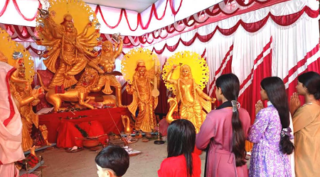 মহাসপ্তমীতে মন্ডপ ঘুরে দেখা গেছে, ভক্তরা প্রার্থনায় ব্যস্ত সময় পার করছেন। পুরোহিতের সঙ্গে মন্ত্রে সুর মিলিয়ে করছেন দুর্গা মায়ের বন্দনা। কেউ কেউ এসেছেন শুধু দেবী দর্শনে। পূজা শেষে বিতরণ করা হয়েছে মহাপ্রসাদ। হিন্দু ধর্মের বিশ্বাস অনুযায়ী, মহালয়ার দিন ‘কন্যারূপে’ ধরায় আসেন দশভূজা দেবী দুর্গা। বিসর্জনের মধ্য দিয়ে তাকে এক বছরের জন্য বিদায় জানানো হয়। তার এই ‘আগমন ও প্রস্থানের’ মাঝে আশ্বিন মাসের শুক্লপক্ষের ষষ্ঠী থেকে দশমী তিথি পর্যন্ত পাঁচ দিন চলে দুর্গোৎসব। পঞ্জিকামতে, দেবী দুর্গা এবার গজে আগমন করবেন এবং দোলায় পৃথিবী ছেড়ে যাবেন।