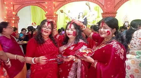বৃহস্পতিবার সকালে মণ্ডপে মণ্ডপে আনুষ্ঠানিক পূজা অর্চনা এবং সিঁদুর খেলার মধ্যে দিয়ে ভক্তরা মা দূর্গাকে স্ব স্ব অধিষ্ঠান থেকে আনুষ্ঠানিক বিদায় দেবেন। তাই মণ্ডপে মণ্ডপে আজ শুধুই বিষাদের ছায়া। উলুধ্বনি, শঙ্খ, ঘণ্টা আর ঢাকঢোলের বাজনায় থাকবে দেবী দুর্গার বিদায়ের সুর।