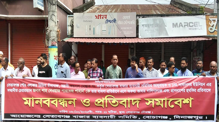 গতকাল ৮ অক্টোবর বুধবার সকাল হতে বেলা ১২টা পর্যন্ত শহরের সকলের সকল দোকানপাট বন্ধ রেখে স্থানীয় চৌরাস্তা মোড়ে সমবেত হন সর্বস্তরের ব্যবসায়ী মহল। মানববন্ধন ও প্রতিবাদ সমাবেশে শতশত ব্যবসায়ীদের মধ্যে বক্তব্য রাখেন ব্যবসায়ী মোঃ রুবেল, ইমরুল রেজা, আলমগীর শাহ, মোঃ মাসুদ খাঁন, স্বাধীন, পৌর বিএনপির সভাপতি নওশাদ আলী, উপদেষ্টা এমওয়ালী ফ্লাড, ইসলামী শাসনতন্ত্র বিরল-বোচাগঞ্জ আসনের এমপি প্রার্থী রেদওয়ানুল হক রাবিদ, যুবদল নেতা সুমন চৌধুরী ও ব্যবসায়ী সমিতির আহবায়ক শাহনেওয়াজ পারভেজ সাহান প্রমুখ বক্তব্য রাখেন।