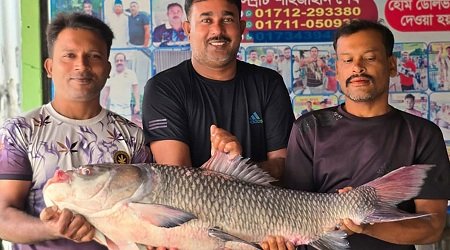 এর আগে আজ ভোরে দৌলতদিয়া ফেরিঘাটের ভাটিতে বাহিরচর এলাকায় পদ্মায় কাতলটি ধরা পড়ে জেলে কালিপদ হালদারের জালে। স্থানীয় সূত্র জানায়, পদ্মা ও যমুনা নদীর ‘সঙ্গমস্থল’ রাজবাড়ীর গোয়ালন্দে। সেখানে জেলেদের জালে ধরা পড়ছে পাঙ্গাশ, বাঘাইড়, চিতল, বোয়াল, ইলিশসহ বিভিন্ন প্রজাতির ছোট-বড় মাছ। গতকাল বুধবার দিবাগত মধ্যরাতে গোয়ালন্দের দৌলতদিয়া ফেরিঘাটের ভাটিতে বাহিরচর এলাকায় পদ্মার মাঝনদীতে নৌকা নিয়ে মাছ শিকারে নামেন জেলে কালিপদ হালদার ও তার সঙ্গীরা। তাদের বাড়ি পাবনার বেড়া উপজেলার নাকালিয়া গ্রামে।