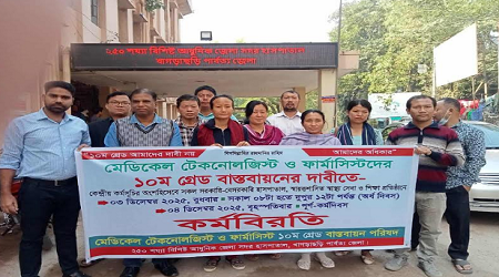 মেডিকেল টেকনোলজিষ্ট ও ফার্মাসিষ্টগন।উল্লেখ্য ১০গ্রেড দাবী এর মধ্যে বাস্তবায়ন করা হলে আগামী ০৪/১২/২৫ইং রোজ বৃহষ্পতিবার পূর্ন দিবস অর্থ্যাৎ কমপ্লিট শাটডাউন কর্ম বিরতি পালিত হবে।দাবী আদায়ের জন্য সবাইকে আজকের মতো ঐক্য বদ্ধভাবে সুশৃঙ্খলতার সহিত কর্ম বিরতি পালনের আহবান জানান।