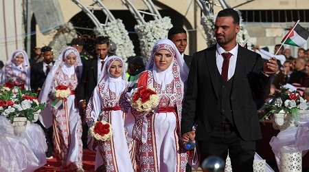 কনেদের হাতে ছিল ফুলের তোড়া। বরেরা তাদের পাশে হাঁটছিল এবং তাদের হাতে ছিল দেশের ছোট আকারের পতাকা। গণবিয়ের এই আয়োজন দেখতে জমায়েত হয় শত-শত ফিলিস্তিনি। কিছু মানুষ জটলা পাকিয়ে দৃশ্য উপভোগ করেছে। অন্যরা আশপাশের ধ্বংসপ্রাপ্ত ভবনের ওপর উঠে ঝুঁকিপূর্ণভাবে বসে থেকে অনুষ্ঠান উপভোগ করেছে। নব-দম্পতিদের প্রত্যাশা— দুই বছরের বিধ্বংসী যুদ্ধ এবং মানবিক সংকটের পর এবার শান্তি বজায় থাকবে। গণবিয়ের আয়োজন করেছে সংযুক্ত আরব আমিরাতভিত্তিক আল-ফারিস আল-শাহিম ফাউন্ডেশন।
