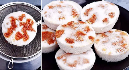 এরপর ওপরে অল্প চালের গুঁড়া দিয়ে পাতলা কাপড়ে দিয়ে বাটির মুখ ঢেকে ছিদ্রযুক্ত ঢাকনির ওপর বাটি উল্টে তা সরিয়ে নিন। ২ থেকে ৩ মিনিট অপেক্ষা করুন। তারপর পিঠাটিতে নারিকেল ছড়িয়ে গরম গরম পরিবেশন করুন।