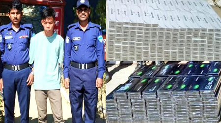 আলমগীর মানিক,রাঙামাটি : রাঙামাটির বরকল উপজেলাধীন হরিণা সীমান্ত দিয়ে ভারত থেকে শুল্কবিহীন অবৈধভাবে আনা প্রায় ৯ লাখ টাকার বিদেশি সিগারেটসহ এক যুবককে আটক করেছে নিরাপত্তাবাহিনী। সোমবার (২২ ডিসেম্বর ২০২৫) দুপুর সাড়ে ১২টার দিকে রাঙামাটির সুবলং চেকপোস্ট এলাকায় একটি বার্মিজ বোটে অভিযান চালিয়ে এসব সিগারেট জব্দ করা হয়।