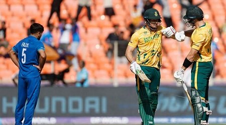 শেষদিকে নুর আহমেদের দুই ছক্কায় রুদ্ধশ্বাস এক টাই পায় আফগানিস্তান। এর আগে রায়ান রিকেলটন আর কুইন্টন ডি ককের জোড়া ফিফটিতে ৬ উইকেটে ১৮৭ রানের চ্যালেঞ্জিং পুঁজি দাঁড় করিয়েছে দক্ষিণ আফ্রিকা। আহমেদাবাদে টস হেরে ব্যাট করতে নেমে শুরুতেই উইকেট হারায় দক্ষিণ আফ্রিকা। অধিনায়ক এইডেন মার্করামকে (৮ বলে ৫) তুলে নেন ফজলহক ফারুকি।