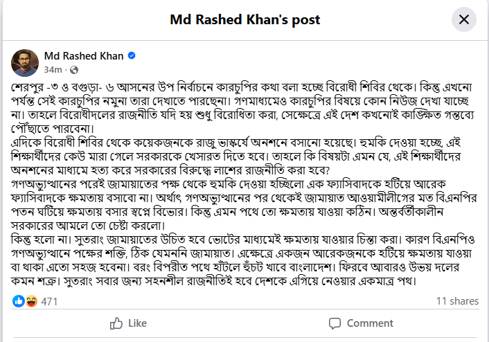 পোস্টে রাশেদ খাঁন লেখেন, শেরপুর -৩ ও বগুড়া- ৬ আসনের উপ নির্বাচনে কারচুপির কথা বলা হচ্ছে বিরোধী শিবির থেকে। কিন্তু এখনো পর্যন্ত সেই কারচুপির নমুনা তারা দেখাতে পারছে না। গণমাধ্যমেও কারচুপির বিষয়ে কোনো নিউজ দেখা যাচ্ছে না। তাহলে বিরোধী দলের রাজনীতি যদি হয় শুধু বিরোধিতা করা, সেক্ষেত্রে এই দেশ কখনোই কাঙ্ক্ষিত গন্তব্যে পৌঁছাতে পারবে না।