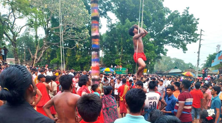 তোবারক হোসেন খোকন দুর্গাপুর (নেত্রকোনা) প্রতিনিধি : চৈত্রসংক্রান্তি উপলক্ষে প্রতিবছরের মতো এবারও নেত্রকোনার দুর্গাপুরে আয়োজন করা হয় চড়কপূজা। মঙ্গলবার (১৪ এপ্রিল) বিকেলে পৌর শহরের দশভুজা বাড়ি মন্দির চত্বরে এ চড়কপূজা অনুষ্ঠিত হয়। এই পূজার বিশেষত্ব হলো, খালি পায়ে ভক্তরা আগুনের মধ্য দিয়ে হাঁটাচলা করেন, পিঠে বিশাল আকারের বরশি গেঁথে চড়ক গাছে ঝুলে দেবতাকে প্রনাম করেন।